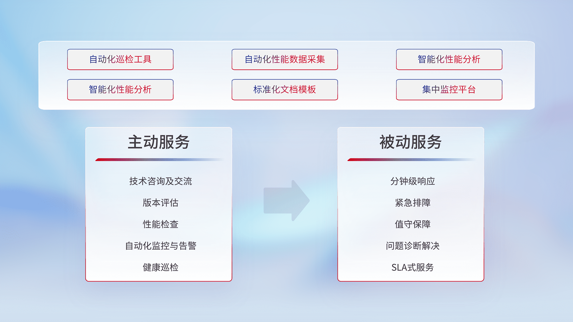 智能化工具和标准化文档,,,保障服务质量,,提供主动服务(包含技术咨询、、、、版本评估、、性能检查、、自动化监控与告警、、、健康巡检)和被动服务包含(分钟级响应、、、、紧急排障、、、、值守保障、、、、问题诊断解决、、、SLA服务)。。。。